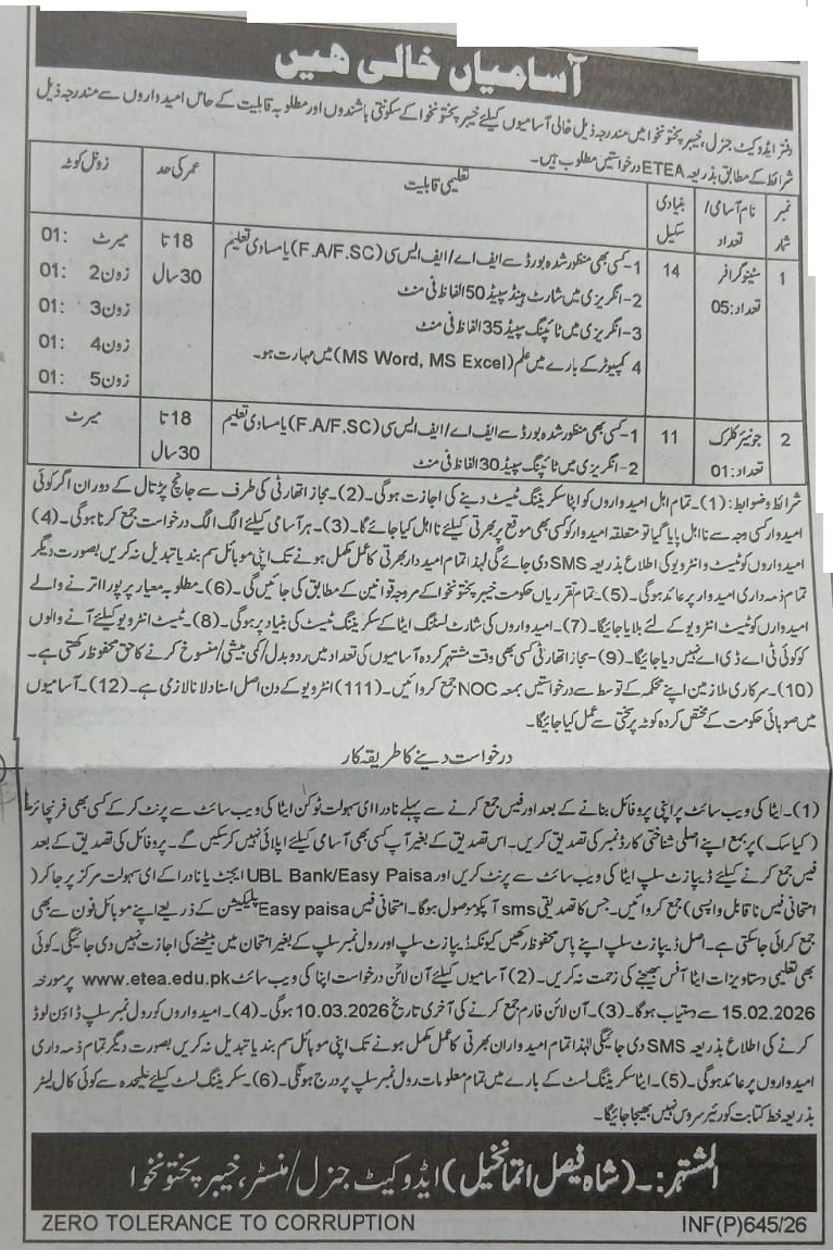 The Advocate General of Khyber Pakhtunkhwa has announced multiple vacancies. Recruitment will be conducted through the Educational Testing and Evaluation Agency (ETEA), Government of Khyber Pakhtunkhwa.