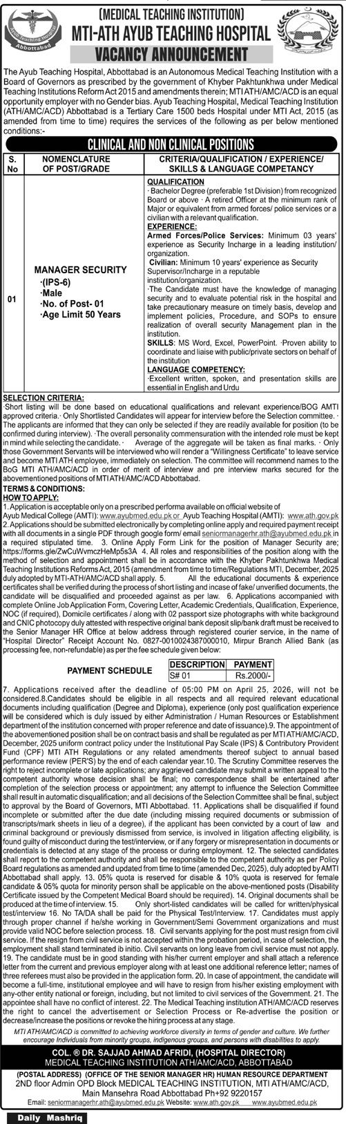 The Ayub Teaching Hospital (ATH), Abbottabad, an Autonomous Medical Teaching Institution, has officially announced a high-level vacancy for the position of Manager Security (IPS-6).