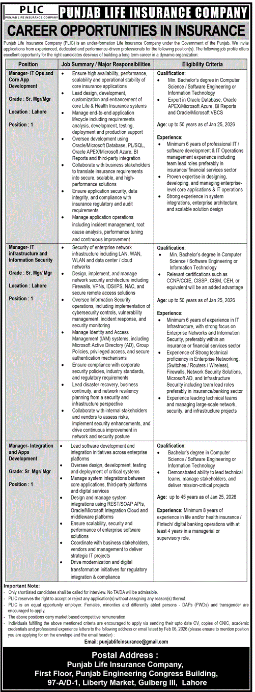 Career Opportunities at Punjab Life Insurance Company (PLIC), a leading life insurance provider under the Government of Punjab, is hiring experienced and dedicated individuals for several senior managerial positions. This is an excellent opportunity to build a long-term career in a growing and vibrant sector.