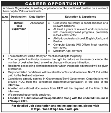 A Private Organization announced its District Field Supervisor Jobs in Abbottabad. A graduation in Social Sciences and 2 years of experience are required. Apply online by April 27, 2026.