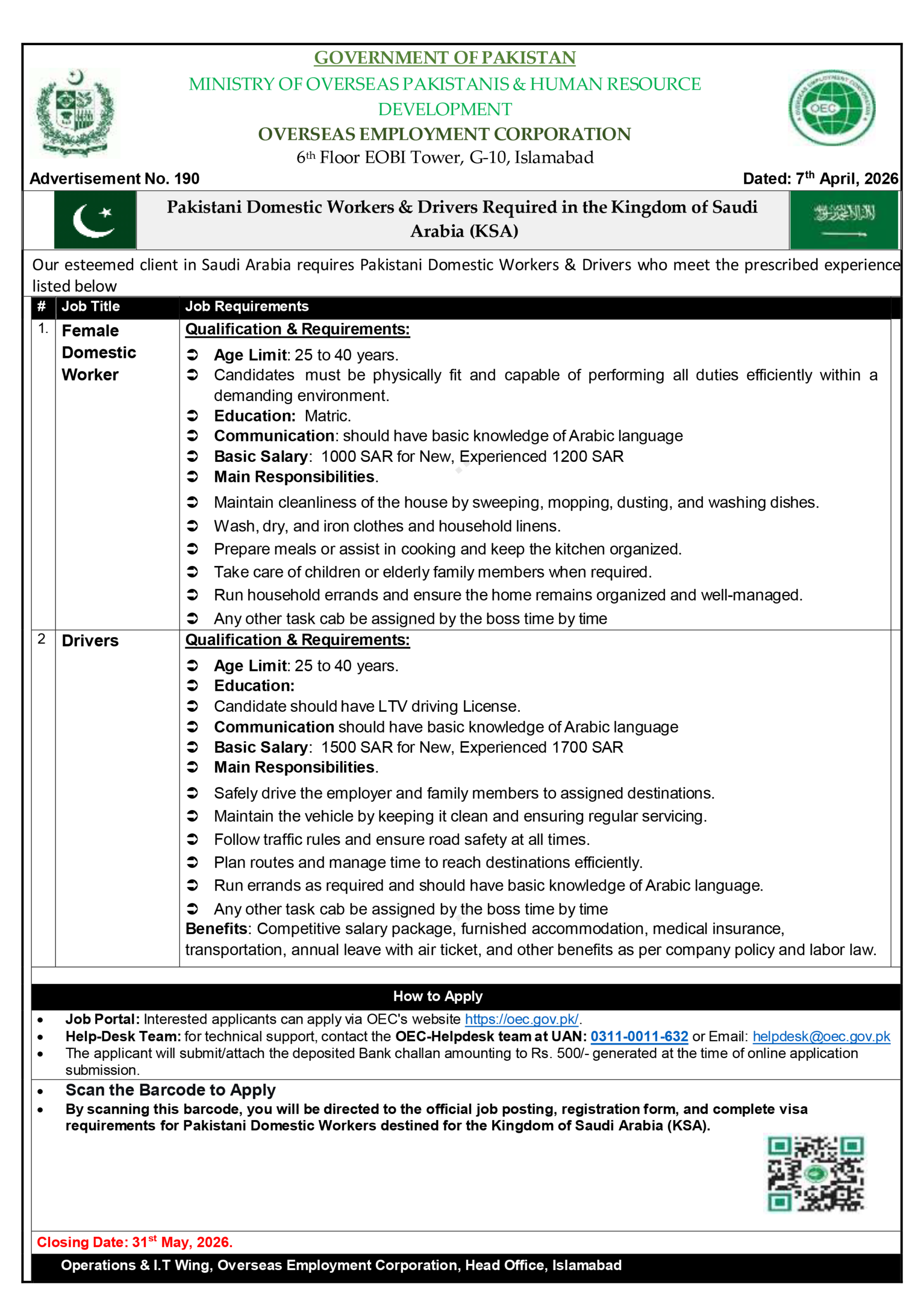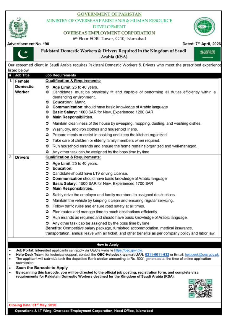 The Overseas Employment Corporation (OEC) is hiring Pakistani female domestic workers and drivers for KSA. Earn up to 1700 SAR + free accommodation & tickets. Apply online by April 2026.