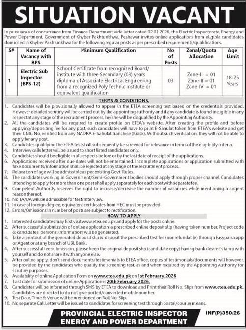 The Energy and Power Department, Government of Khyber Pakhtunkhwa, has announced an excellent opportunity for the Electric Sub Inspector (BPS-12) vacancy, including eligibility criteria, application process, important dates, and key instructions.