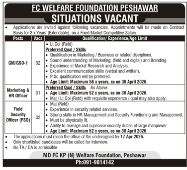 If you are a retired Lt Col or Major with a knack for marketing or security management, these roles at the FC Welfare Foundation, Peshawar, offer the perfect transition into a corporate welfare environment. With the deadline of April 17, 2026, approaching fast, we recommend preparing your documents immediately.