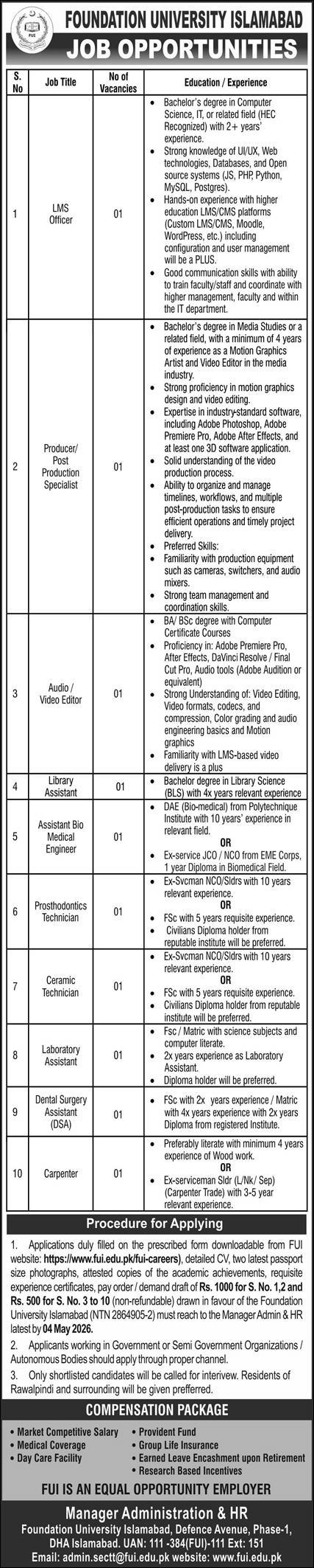Apply for the latest Foundation University Islamabad (FUI) Jobs 2026. Vacancies include LMS Officer, Producer, Audio/Video Editor, Library Assistant, and more. Competitive salary and benefits. Last date: May 4, 2026.