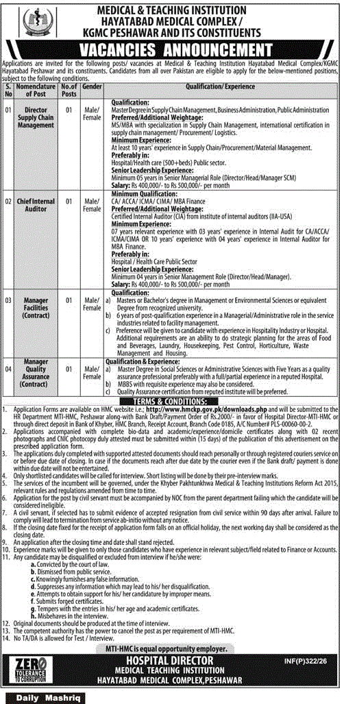 The current vacancies announcement at Hayatabad Medical Complex includes the following positions: