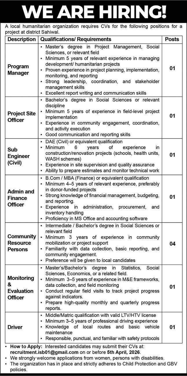 Explore the latest Humanitarian Organization Jobs in Sahiwal for March 2026. Detailed guide on vacancies, eligibility, and how to apply via recruitment.isb01@gmail.com