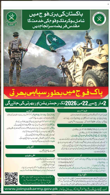 The Pakistan Army has officially announced its latest recruitment drive for Sepoys (Soldiers) for the year 2026. This is a golden opportunity for young, energetic, and patriotic individuals from across Pakistan, Azad Kashmir, and Gilgit-Baltistan to start a prestigious career in the armed forces.