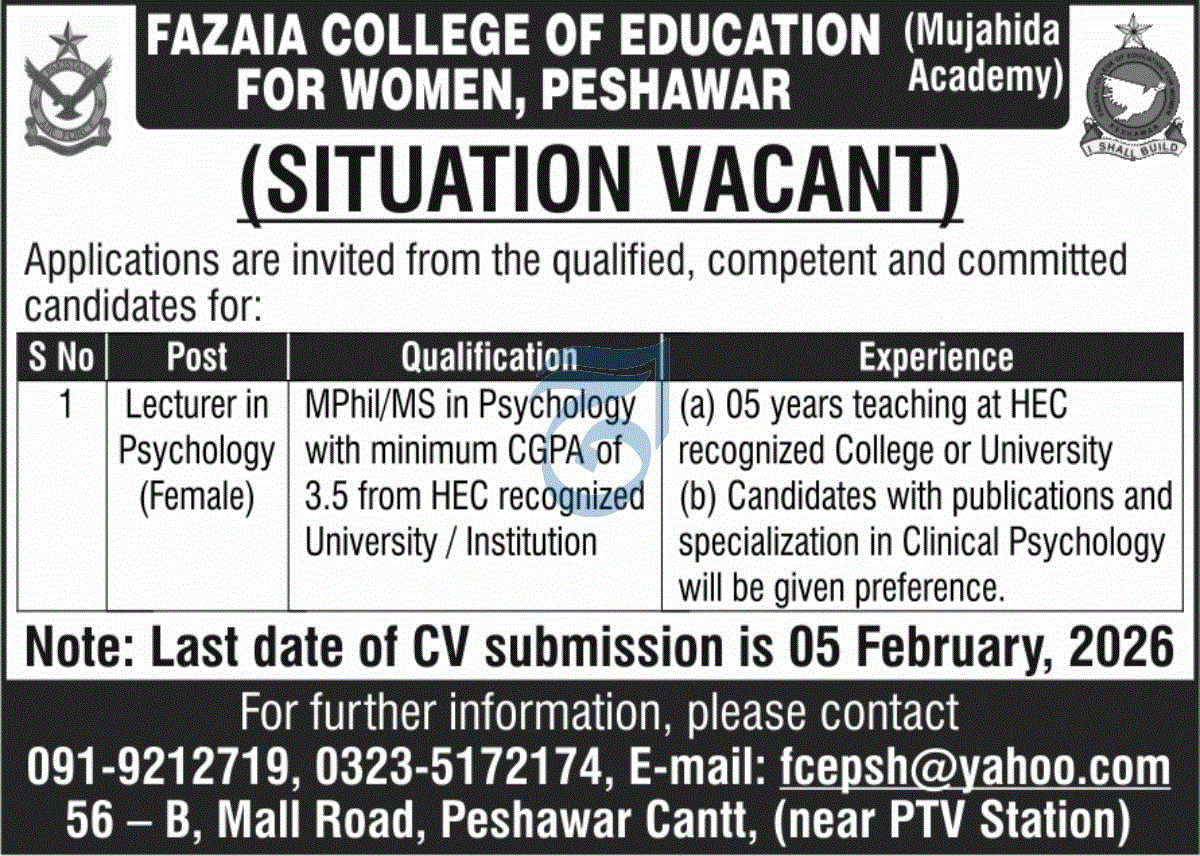 Fazaia College of Education for Women, Peshawar, a prestigious HEC-recognized institution, is looking for a dedicated Lecturer in Psychology (Female) to join their academic team. This is a fantastic opportunity for experienced professionals to contribute to the next generation of psychologists and educators in a supportive and dynamic environment.