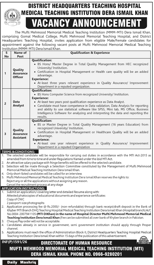 Apply for the latest job vacancies at Mufti Mehmood Memorial Medical Teaching Institution (MMM-MTI), Dera Ismail Khan, Jobs 2026. Positions include Quality Assurance Officer, Data Analyst, and Assistant. Deadline: April 26, 2026.
