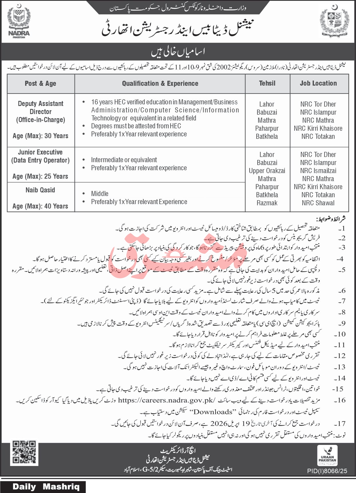 Apply for NADRA Jobs 2026! Vacancies for Deputy Assistant Director, Junior Executive, and Naib Qasid. Check eligibility and apply online before April 19, 2026.