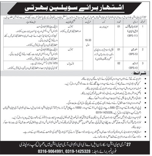 Apply for Pak Army Civilian Jobs 2026 at 27 Army Aviation Squadron, Dhamial Camp, Rawalpindi—vacancies for LDC, Storeman, and Driver. Apply within 15 days!