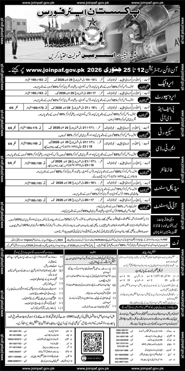 The Pakistan Air Force jobs 2026 has officially been announced for the recruitment of Aero Technician, Aero Support, PAF GD, Security, ICT Staff & Medical Assistants, etc, open to eligible male and female candidates across Pakistan. Online registration will be conducted through the official PAF website www.joinpaf.gov.pk.