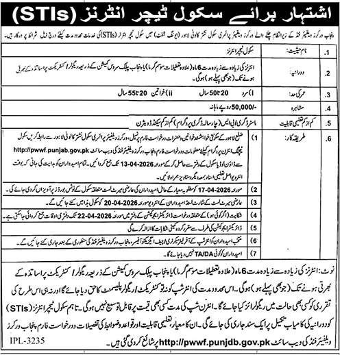 Apply for School Teacher Intern (STI) jobs 2026 at Workers Welfare Fund (PWWF) Punjab. Monthly stipend Rs. 50,000. Check eligibility, dates, and how to apply for Lahore schools.