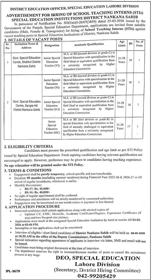 The District Education Officer (Special Education), Lahore Division, has announced a new hiring opportunity for School Teaching Interns (STIs) in Special Education Institutions located in District Nankana Sahib. This is a temporary, fixed-term engagement under the Government of Punjab’s Special Education Department for the financial years 2025–27.
