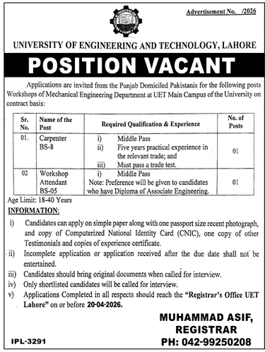 Looking for UET Lahore Jobs 2026? Apply for Carpenter & Workshop Attendant posts at the University of Engineering and Technology. View eligibility and apply by April 20!
