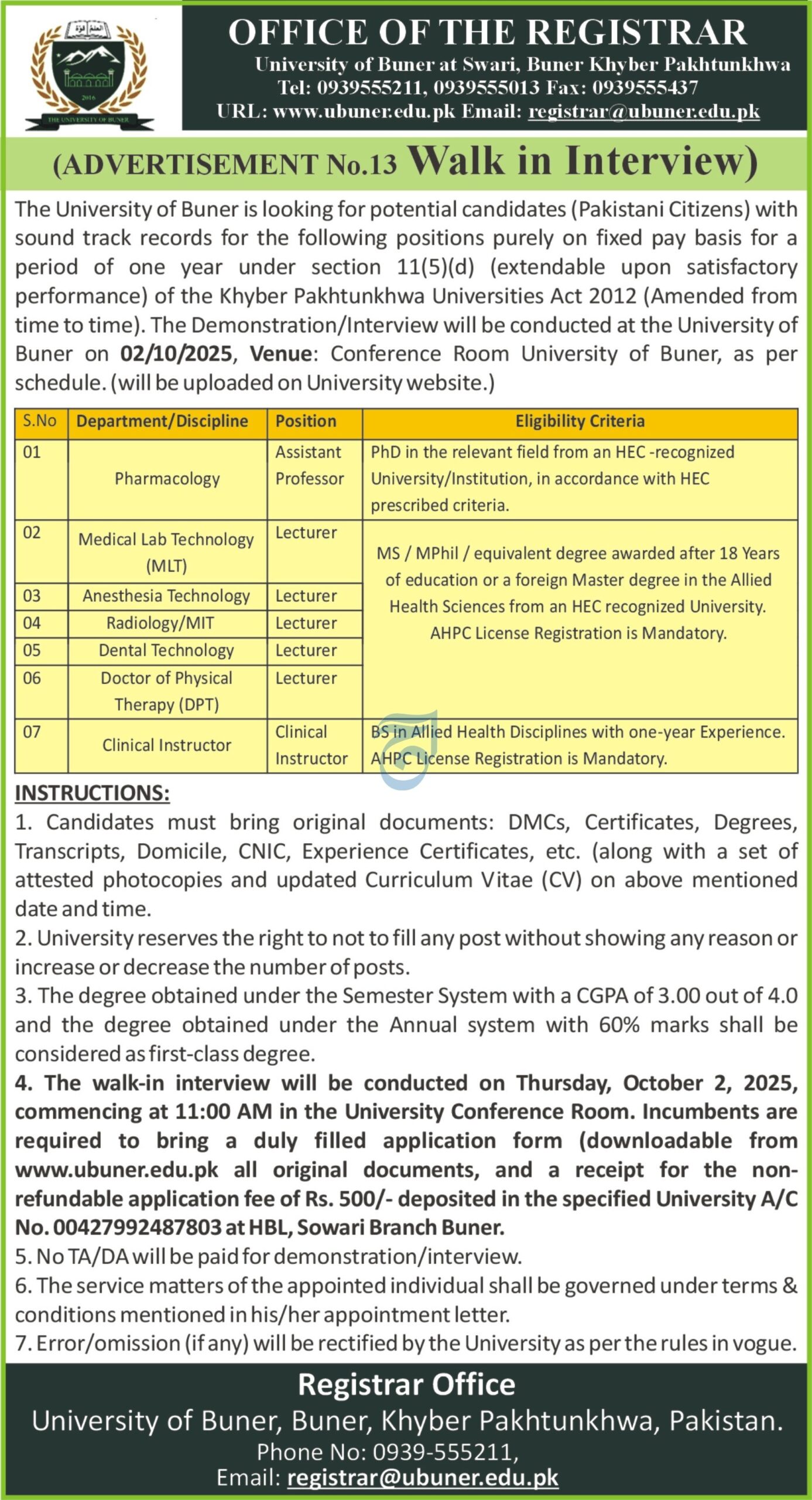 University of Buner Jobs 2025 – Walk-in Interview for Teaching Faculty