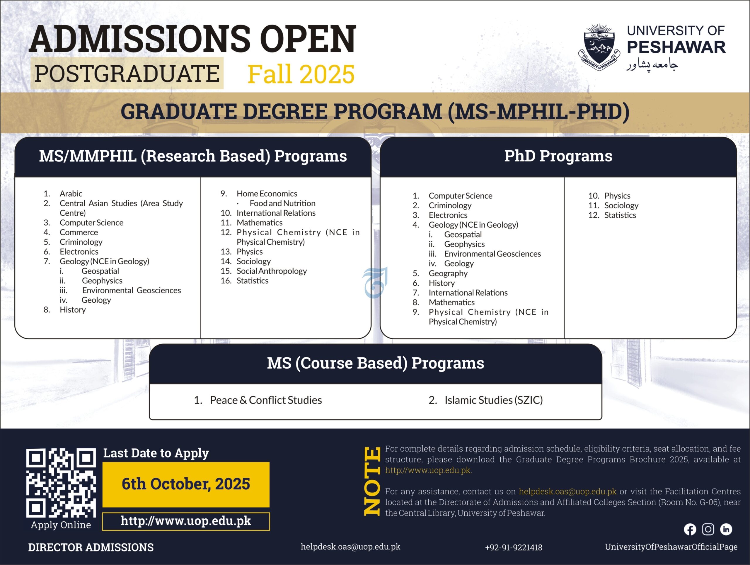 The University of Peshawar (UoP) has officially announced admissions for its wide range of postgraduate programs for the Fall 2025 semester. This is a golden opportunity for students across Pakistan and beyond to advance their academic careers with MS, MPhil, and PhD degrees in diverse and high-demand fields.